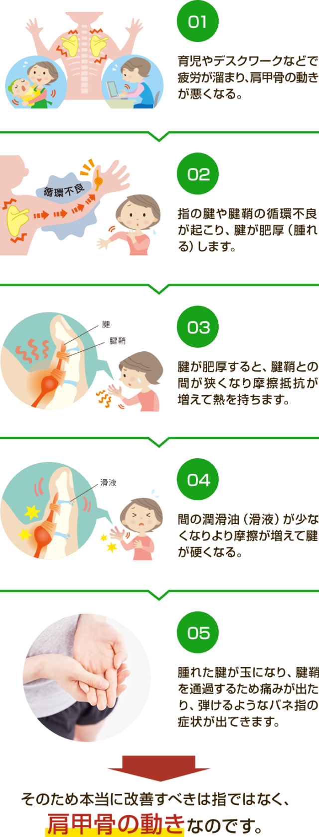 その結果、肩甲骨と肋骨が固定されて固まると腕を動かすために上腕の筋肉や前腕の筋肉が必要以上 に疲労をもち筋肉や腱が張り腱鞘炎やバネ指になります。